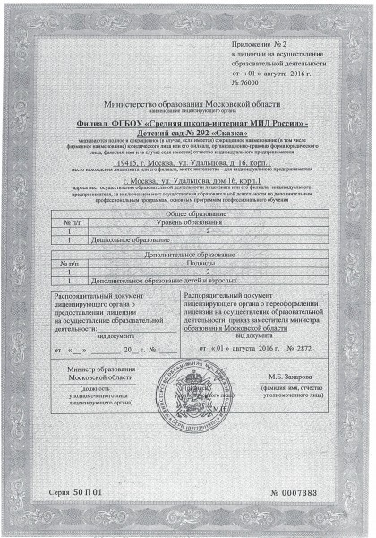 | Сокращенное наименование образовательной организации* | Филиал ФГБОУ "Средняя школа-интернат МИД России" - Детский сад № 292 "Сказка" |